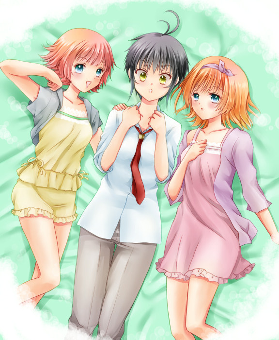 新条姉妹に挟まれてドギマギ(?)する育。