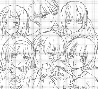 集合絵が途中で力尽きてしまう事について、一人ずつ別々に描いてあとでまとめる方法を去年制服全身絵でやろうとした時も、4人描いてから力尽きてやめたんですよね…(笑)