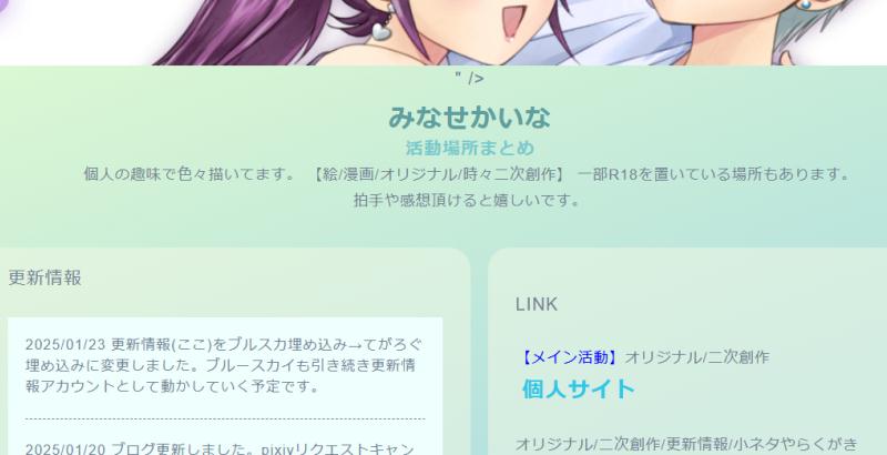 リンクまとめページとブルスカはpixiv等外部から来られる方向けのページとして作っていた為サイトからはリンクしていなかったのですが、今いじってるのがちゃんと出来そうならABOUTかどっかからリンク置いておきます。まだいじり中なので、ちゃんと出来てから…。